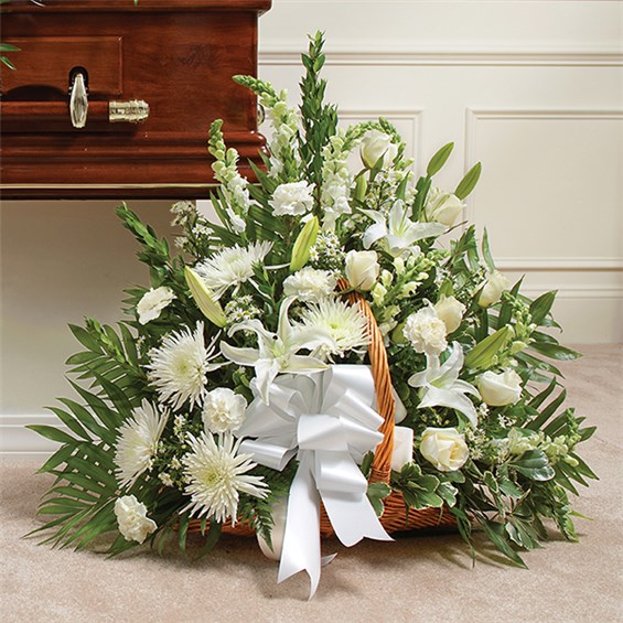 A pure heart. A peaceful spirit. A life so beautifully lived. Our fireside basket arrangement, hand-designed by expert florists with a splay of pristine white roses, captures this thoughtful sentiment in a grand display, beautifully suited for the funeral or gravesite.